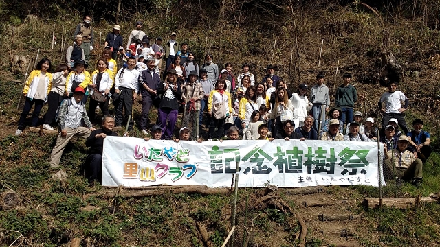 快晴の下、「第16回記念植樹祭」を楽しく開催しました。補植もしながら100本を植え終えました。