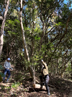 今回はすでに伐採した木を短く切ってまとめていく作業や、幹に絡まっているつるをはがす作業を行いました。絡まったつるをはがすのは意外に根気のいる作業で、1時間もしていると生徒たちはみんな汗びっしょりでした。