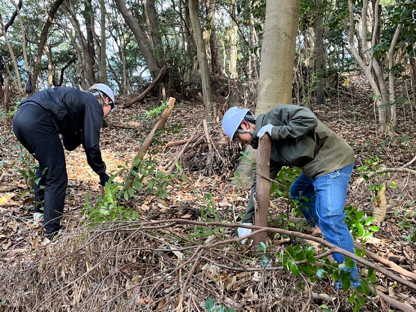 枯葉で滑りやすい傾斜で怪我をしないように、ゆっくりと一歩ずつ移動しながら作業しました。