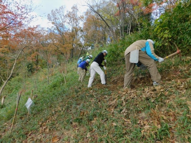 活動初期(8年ぐらい前)に作った植樹地(中部)の作業道約80mの補修・整備作業と活動地(上部)への伐採木を活用した簡易ベンチの設置作業等を行いました。スコップやツルハシでの山肌削り、ゲンノウでの杭打ち、ロープをかけての伐採木運びとまさに「土木」作業で、参加者全員が大汗をかきました。