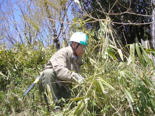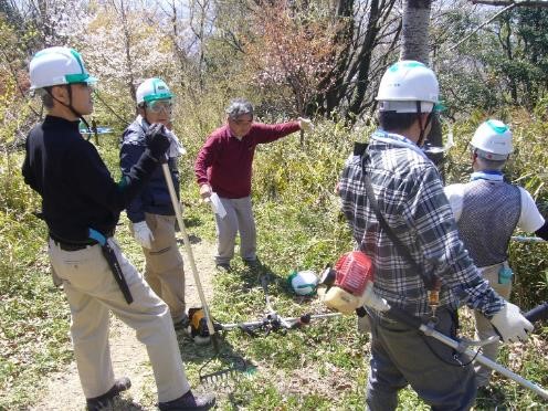 絶好のお天気に恵まれ、平成24年〜平成27年の植樹地の下草刈りを行いました。今まで手が回らず、苗木は伸び放題の下草に埋もれていましたが、今回の活動で元気な姿を見せてくれました。平成26年に植樹した桜が満開で、参加者一同から思わず笑みがこぼれるほど嬉しく、そのせいか活動にも熱が入り、予定以上の作業をこなすことができました。