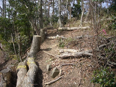 事務所による危険木の伐採で出たガラ整理や伐採木を利用した通路整備、ネザサ刈りを行いました。伐採木は等高線に沿って水平に整理されており「プロの仕事」に感銘を受けました。