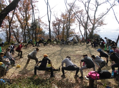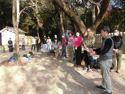 穏やかな気候のもと、43人が参加して植樹を行いました。活動には、老祥記の曹さんが応援で駆けつけてくださり、紅葉が残る保久良神社でオープニングを行いました。