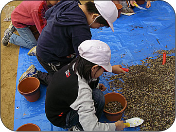 学校に戻り、大人も知らないどんぐりの秘密を色々と教わりました。ちびっこどんぐり博士の誕生です。その後、拾ってきたどんぐりをそれぞれの植木鉢に植えました。卒業までの2年間しっかりと育てることを約束しました。