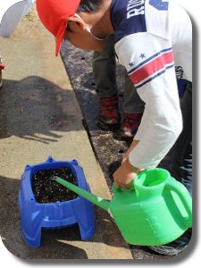 学校へもどり、芽の出るどんぐりの調べ方や、どんぐりの植え方を勉強しました。その後、水をはったバケツにどんぐりを入れて芽が出る実をえらび、ていねいに植えて水やりをしました。自分たちのどんぐりが元気に大きくなって、山やまちを守ってくれるように、しっかり育ててくださいね。