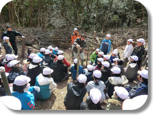 先週は突然の大雪で出発直前に中止でしたが、今度は晴れました。学校で先生から注意事項を聞いた後、6年生80人が植樹に向けて出発しました。山を登ったり下ったり、森の中を進むと植樹地に到着です。
