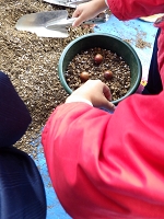 公園には4〜5しゅるいのどんぐりの木があり、大人でも見分けにくい形のどんぐりがたくさん落ちています。子どもたちはあちこち走り回りながら「植えるどんぐり?植えないどんぐり?」と写真とひろったどんぐりを見くらべて「これだ!」と思うのを持ち帰りました。