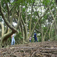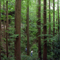 六甲山では、一種類の高木がほぼ同じ高さで生えている森林はほとんどありません。そのような森林があれば、人が植栽し、作り上げてきた林の証拠です。六甲山では、多くの樹木が植栽されきました。その中で、幹がまっすぐに伸びるのは、針葉樹の特徴です。六甲山では、針葉樹の一斉林として、スギ、ヒノキ、メタセコイアの森が見られます。この内、メタセコイアは谷筋に植栽されているため、林床には多数の草本植物が生育しています。