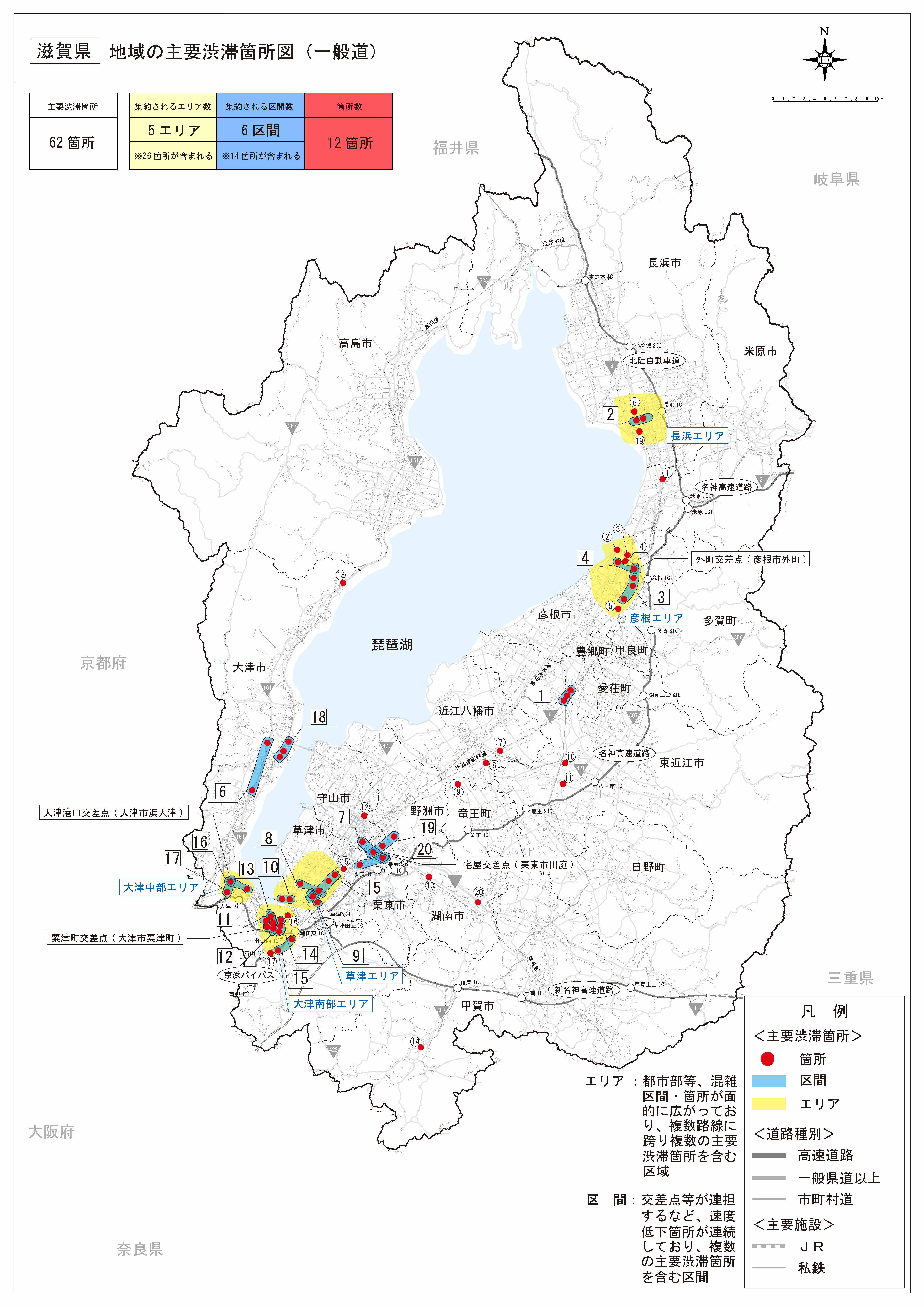 滋賀県内における道路の効果的な渋滞対策を進めていくために、「滋賀県渋滞対策協議会」や道路利用者のみなさまからの意見を踏まえ「主要渋滞箇所」を選定しました。