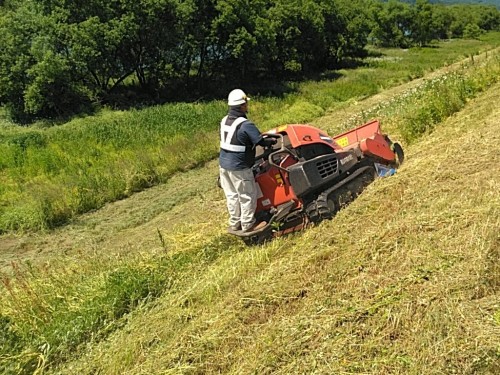 国土交通省豊岡河川国道事務所では、河川堤防の異常を早期発見出来るよう、点検並びに維持管理を目的に年2回、堤防の除草を実施しています。