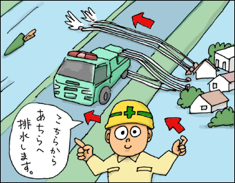 台風や大雨で川の水が堤防を越えてあふれてしまった時に、水をポンプで吸って川に戻し たり、川から水があふれそうな時に、家や道路が水につかるのを防ぎます。 この車のポンプは、小学校のプールを約6分で空にすることができます。