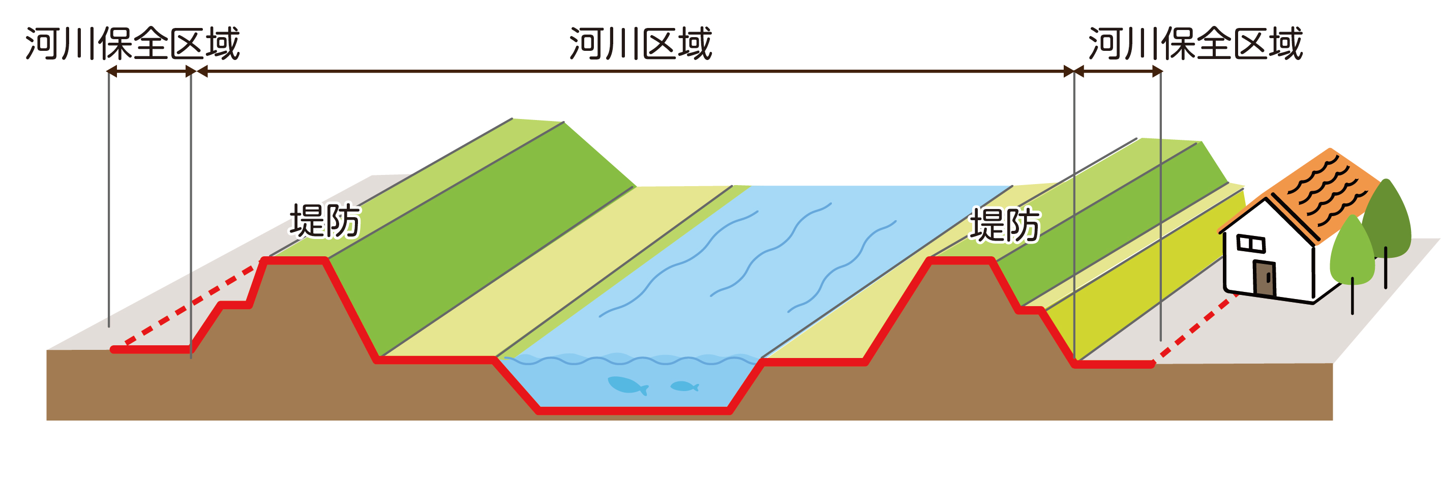 河川保全区域とは、河岸や河川管理施設を保全するために、河川区域に隣接する一定制限を設けている区域のことです。