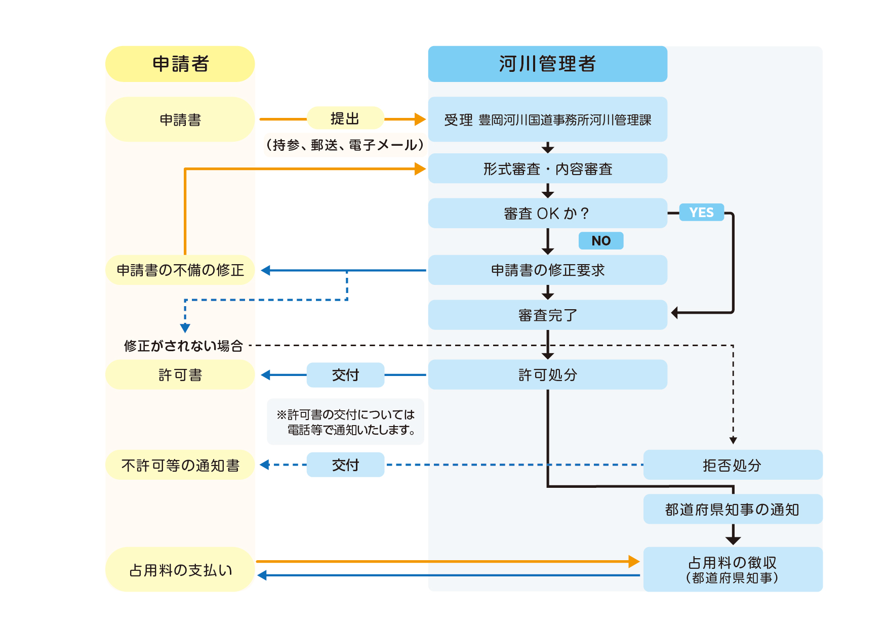 河川は誰もが自由に利用できる公共の空間です。しかし、同時に河川は洪水被害を起こさないよう安全に水を流す防災の役割があり、また、豊かな自然環境としての側面も持ち合わせています。そのため、河川の利用は、他の利用を著しく阻害しない範囲内で、かつ防災や環境保全と調和が図れたものである必要があります。 そこで河川法では、河川の周辺を含めて河川内を利用するにあたって、使用の目的、方法、期間などについて一定の行為を禁止又は制限しており、例えば、排他独占的に使用(占用)したり、河川内に工作物を設置したりするとき等は、河川管理者の許可を受けなければいけません。この手続きを「河川許可申請」といいます。