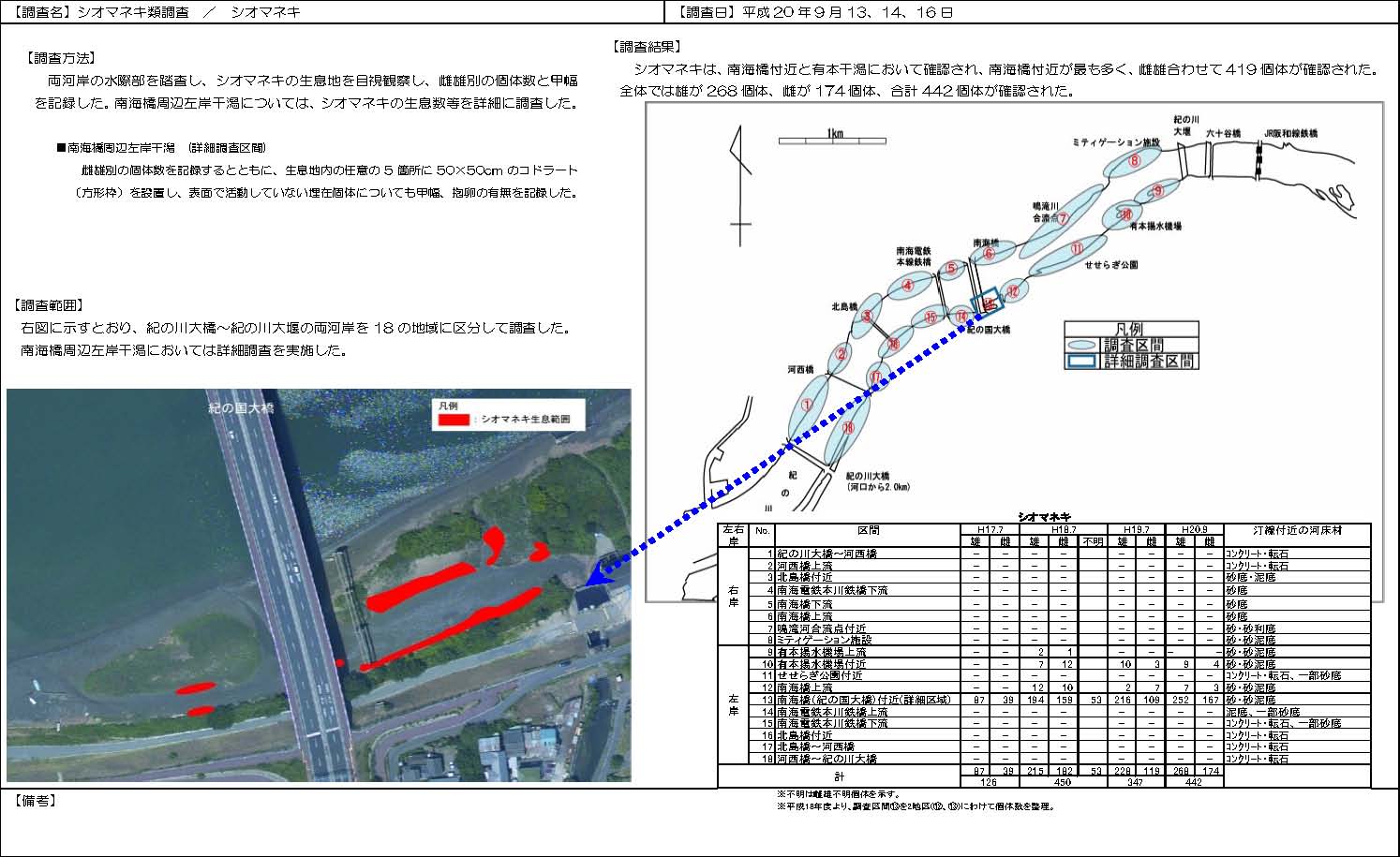 | 【調査範囲】右図に示すとおり、紀の川大橋~紀の川大堰の両河岸を 18の地域に区分して調査した。南海橋周辺左岸干潟においては詳細調査を実施した。【調査方法】両河岸の水際部を踏査し、ハクセンシオマネキの生息地を目視観察し、雌雄別の個体数を記録した。また、南海橋周辺左岸干潟については、ハクセンシオマネキの生息数等を詳細に調査した。■南海橋周辺左岸干潟(詳細調査区間 )雌雄別の個体数を記録するとともに、生息地内の任意の 5箇所に 50×50cmのコドラート(方形枠)を設置し、表面で活動していない埋在個体についても甲幅、抱卵の有無を記録した。 | 【調査結果】ハクセンシオマネキは 4地域で確認され、南海橋付近が最も多く、雌雄合わせて 1,742個体が確認された。全体では雄が 1,009個体、雌が 837個体、合計 1,846個体が確認された。No.区間汀線付近の河床材雄雌雄雌雄雌雄雌 1紀の川大橋~河西橋 --------コンクリート・転石 2河西橋上流 --------コンクリート・転石 3北島橋付近 --------砂底・泥底 4南海電鉄本川鉄橋下流 ------砂底 5南海橋下流 10 4 ----砂底 6南海橋上流 7 3 ------砂底 7鳴滝河合流点付近 --------砂・砂利底 8ミティゲーション施設 3 1 1 -1 1 --砂・砂泥底 巣穴 5個確認 9有本揚水機場上流 15 5 ------砂・砂泥底 10有本揚水機場付近 127 58 69 28 28 16 12 5砂・砂泥底 11せせらぎ公園付近 98 36 ------コンクリート・転石、一部砂底 12南海橋上流 --169 78 299 193 56 25砂・砂泥底 13南海橋(紀の国大橋)付近 (詳細区域 ) 1,978 789 848 280 1,058 401 937 805砂・砂泥底 14南海電鉄本川鉄橋上流 --------泥底、一部砂底 15南海電鉄本川鉄橋下流 --3 2 --4 2コンクリート・転石、一部砂底 16北島橋付近 --------コンクリート・転石 17北島橋~河西橋 --------コンクリート・転石 18河西橋~紀の川大橋 --------コンクリート・転石 2,228 892 1,100 392 1,386 611 1,009 837※巣から出現せず、また巣穴が深いため雌雄の判別が不可能であった5※ 25※ H18.7 H17.7左右岸 3,120 1,492 1,997 1,846計右岸左岸ハクセンシオマネキ H19.7 H20.9 | |