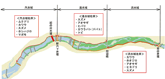 備考)図中の赤枠は「平成12年度紀の川河川水辺の国勢調査」のうち、冬季調査(1~2月)における主な出現種を示しています。