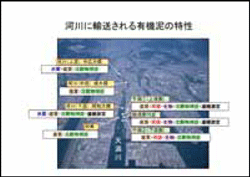 - 太田川派川のひとつである天満川で、川への流入物とその動きを調査しました。市内デルタでは潮汐変動が4mあり,満潮時は多量の有機泥が河川に遡上するために、天満川の上流6.0km地点においても河岸干潟には有機泥がヘドロとして溜まっています。河口には下水の放流渠があり、合流式の下水道では大雨が降ると未処理の下水が河川に放流されます。生活排水を含む汚水,汚泥が、川の中に放出されたことによる河川環境への影響、特に、有機泥の輸送と溜まり方の特性を調査しました。
