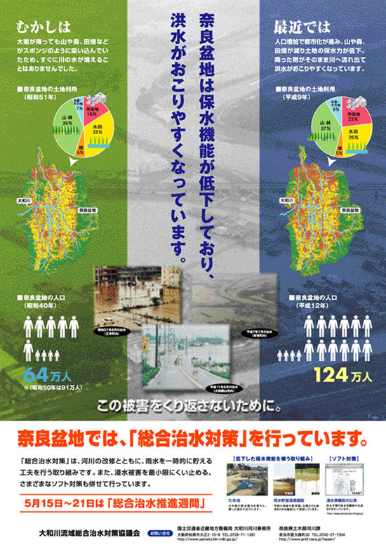 総合治水推進週間 5月15日~21日は「総合治水推進週間」です。 奈良盆地では、人口増加により都市化が進み土地の保水機能が低下しているため「総合治水対策」に取り組んでいます。 総合治水対策では、河川の改修とともに、雨水を一時的に貯える工夫を行っています。また、浸水被害を最小限にくい止める、さまざまなソフト対策も併せて行っています。 画像クリックで拡大