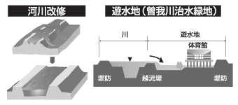 『治水対策』は、安全に水が流れるように川幅を拡げたり、遊水地をつくって一時的に川の水を貯めて、水位が下がると水を川に戻すしくみをつくったりしているんだ。